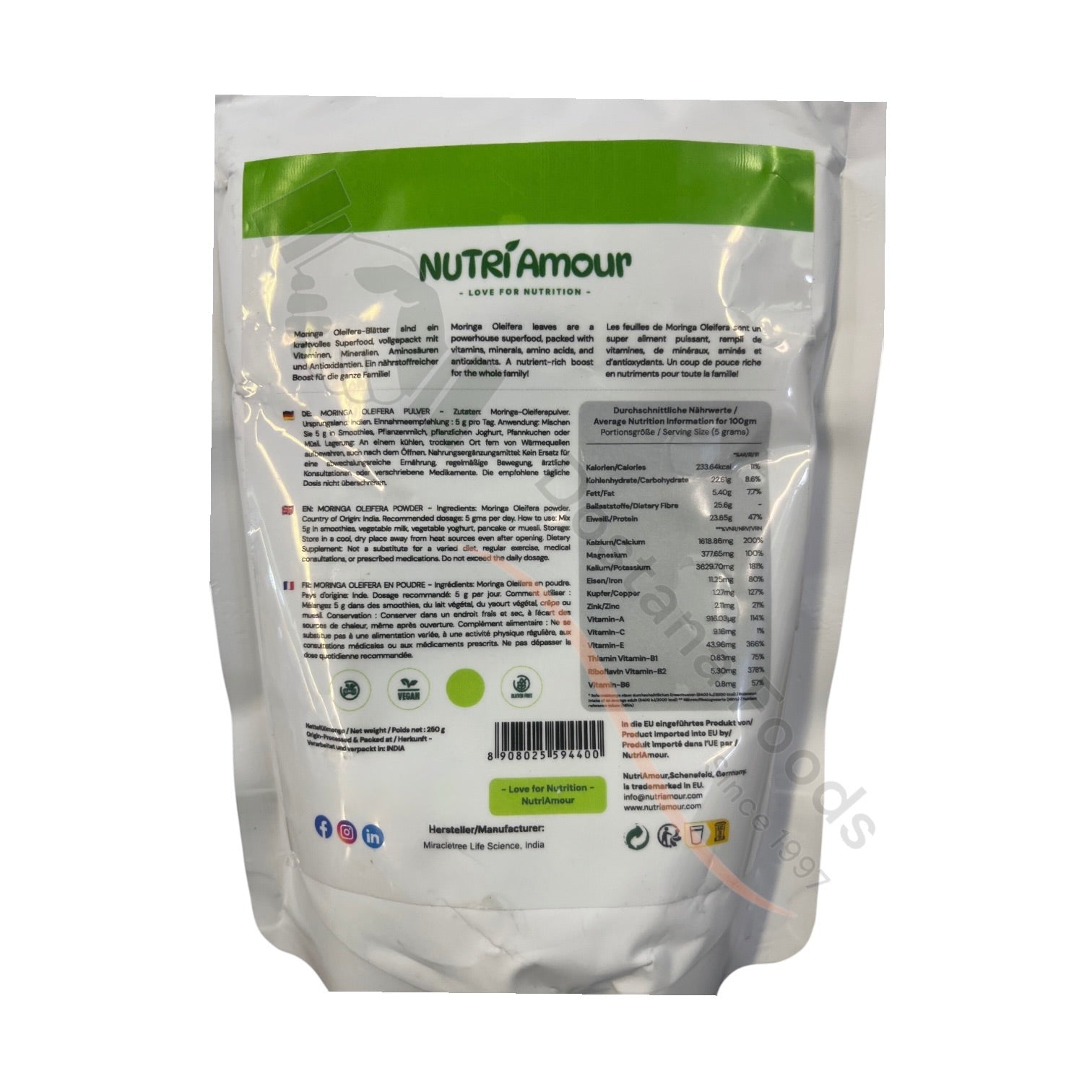 Moringa Pulver ist ein nahrhaftes Pulver, das in Smoothies, Suppen oder indischen Currys genutzt wird. Diese Sorte wird aus Tamil Nadu importiert, und ist eine besonders gute Sorte. Es ist reich an Vitaminen und Mineralstoffen. Der Hersteller kann je nach Lagerbestand variieren.